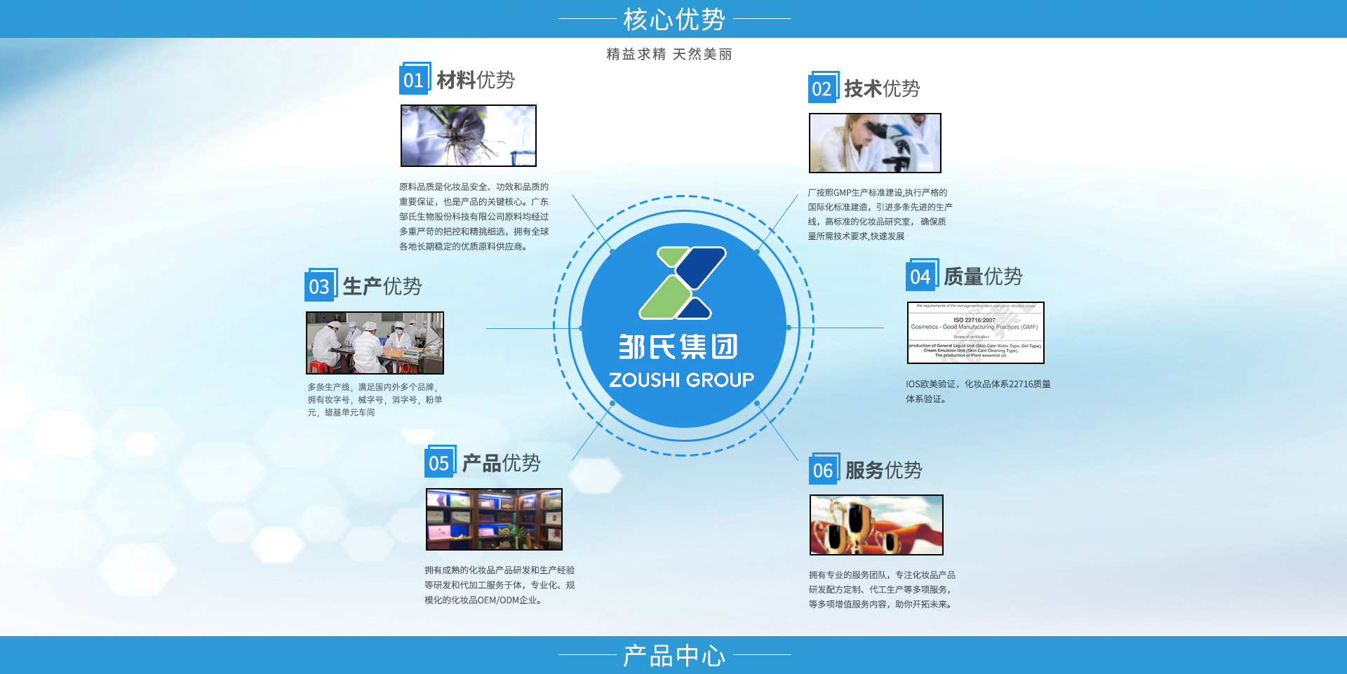 廣東鄒氏生物科技股份有限公司是一家集原料研制、配方開發(fā)、加工生產(chǎn)及配套性服務(wù)為一體的全球化化妝品OEM/ODM服務(wù)企業(yè)。鄒氏生物秉承“精益求精,天然美麗”的經(jīng)營理念,始終孜孜不倦的在美業(yè)領(lǐng)域深耕,經(jīng)過不斷發(fā)展完善與技術(shù)提升,在行業(yè)內(nèi)頗具口碑和影響力。公司擁有雄厚的資金實(shí)力、先進(jìn)的生產(chǎn)設(shè)備以及大批高精專的人才儲備,旨在打造一個(gè)純自主研發(fā),純自主生產(chǎn)以及管理的高科技日用美妝OEM/ODM品牌。 在延續(xù)高質(zhì)量產(chǎn)品和服務(wù)的同時(shí),鄒氏生物始終秉承著純粹的生產(chǎn)理念,在研發(fā)、生產(chǎn)、品控、營銷等多方面升級,配備雄厚的科研力量,引進(jìn)先進(jìn)生產(chǎn)設(shè)備,遵循嚴(yán)苛的品質(zhì)管理標(biāo)準(zhǔn),提供專業(yè)的全方位營銷服務(wù),最大程度地實(shí)現(xiàn)資源整合,致力于成為世界優(yōu)秀化妝品工廠。為廣大品牌商以及消費(fèi)市場輸送品質(zhì)優(yōu)越、高效安全的日用化工、美容美妝、肌膚護(hù)理產(chǎn)品。